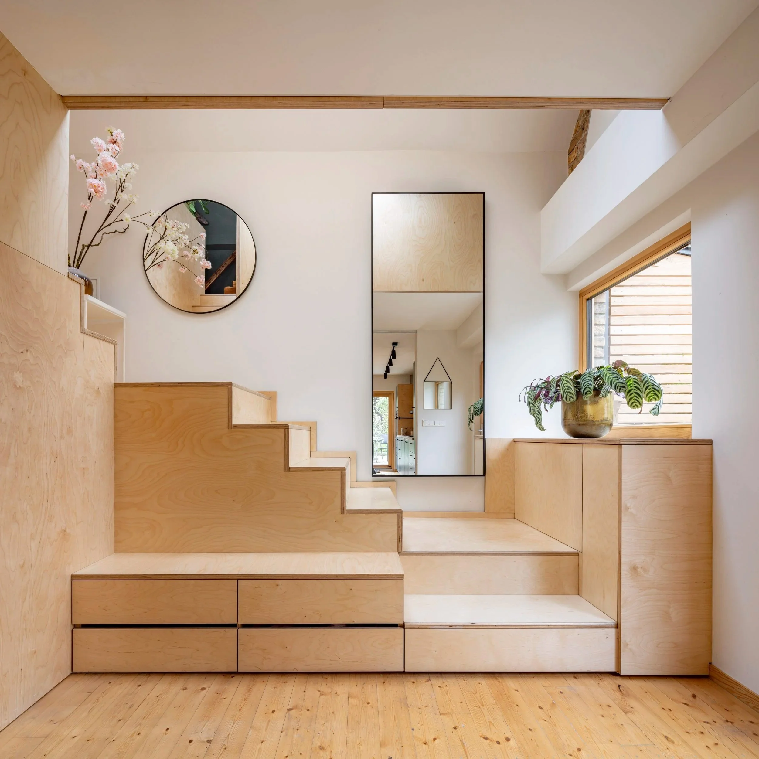 Unsere Bauherrin - freischaffende Künstlerin, Kreativbombe, Mutter und Powerfrau - wünschte sich einen kleinen feinen Lebensraum nur für sich allein. Platzsparend über die Möbeltreppe geht es nun vom Eingangs/Koch- und Essbereich direkt in ihre Privaträume ins Obergeschoss. Die natürlichen Materialien, die zarte Farbgebung und die geschickt organisierten geometrischen Formen lassen dem Kopf ebenso Raum für neue kreative Prozesse, wie auch Erholung.