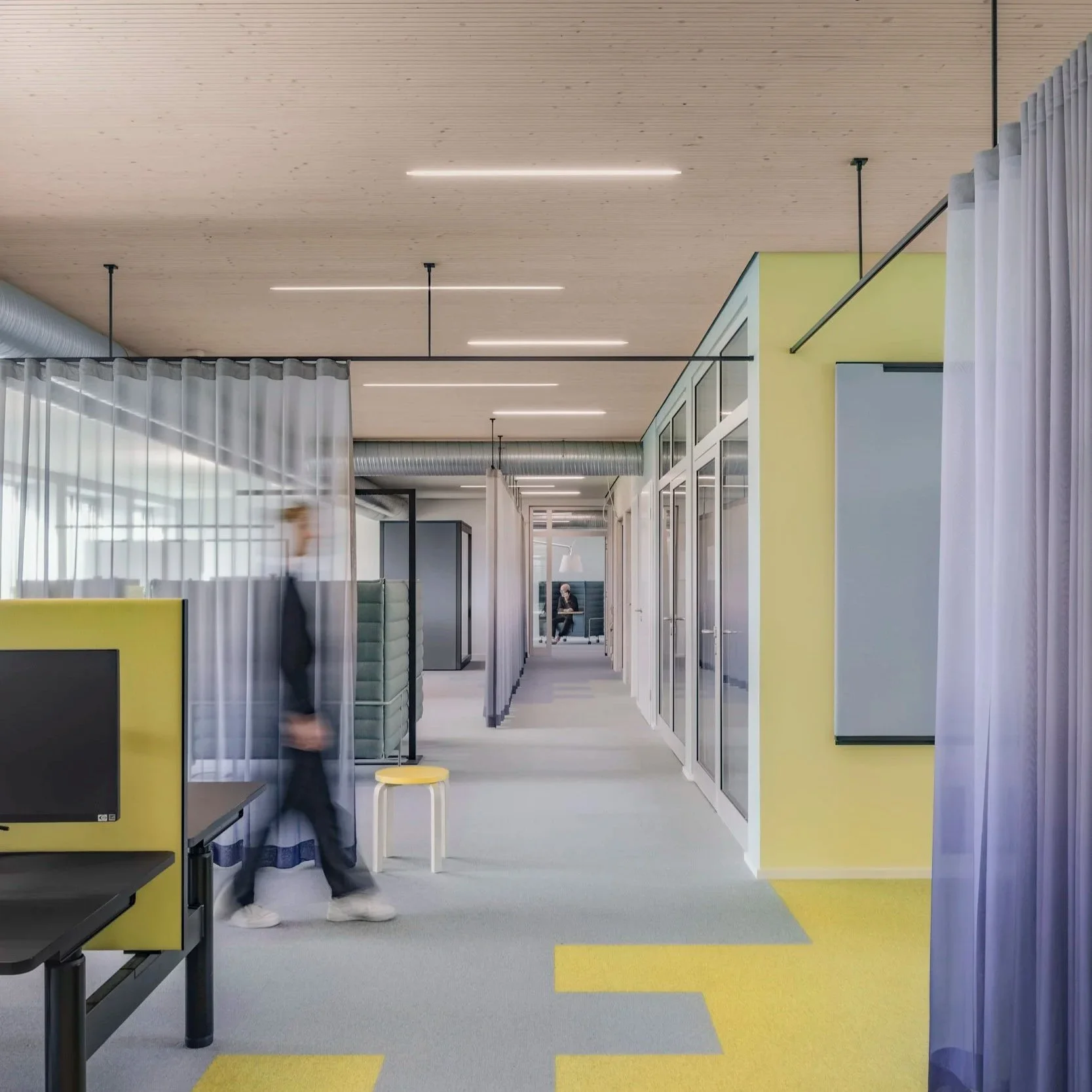 Das neue Interior der Deimel Steuerberatungsgesellschaft setzt auf Offenheit, Flexibilität und Zusammenarbeit. Der Open Space wird durch textile Vorhang-Zonierungen strukturiert, die visuelle Klarheit schaffen, ohne die Transparenz zu verlieren.